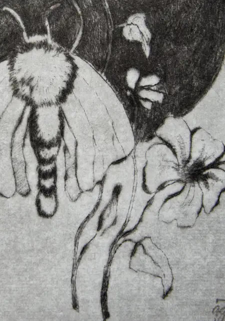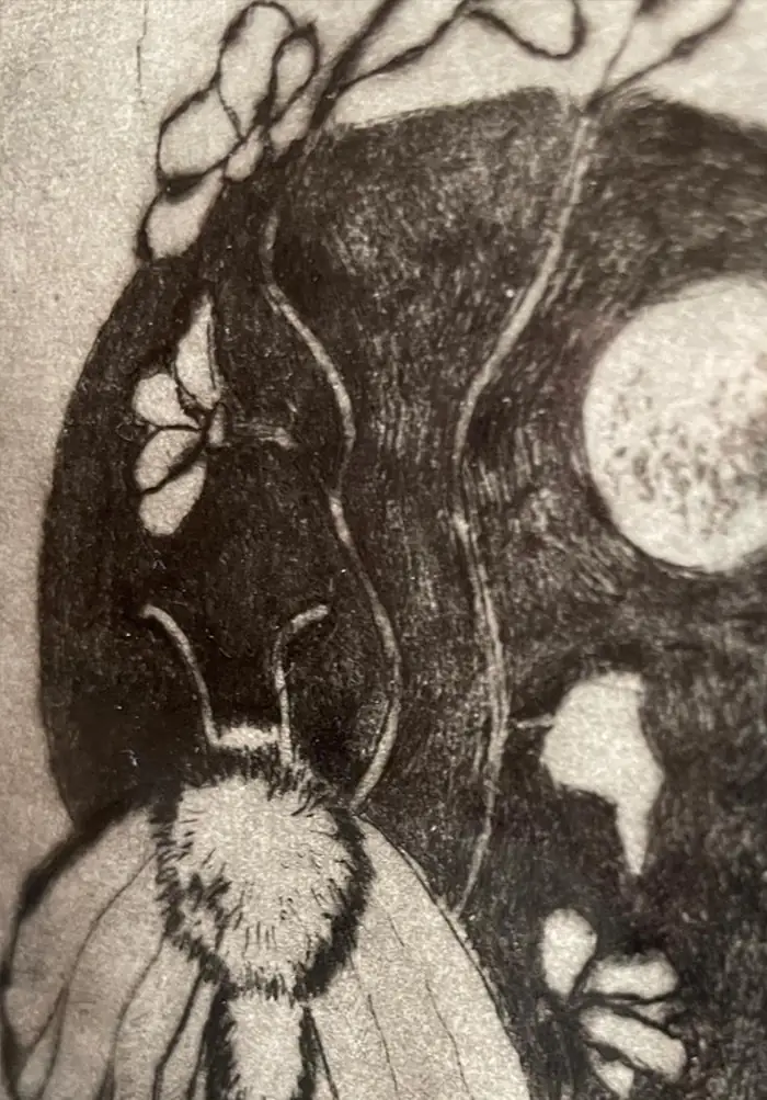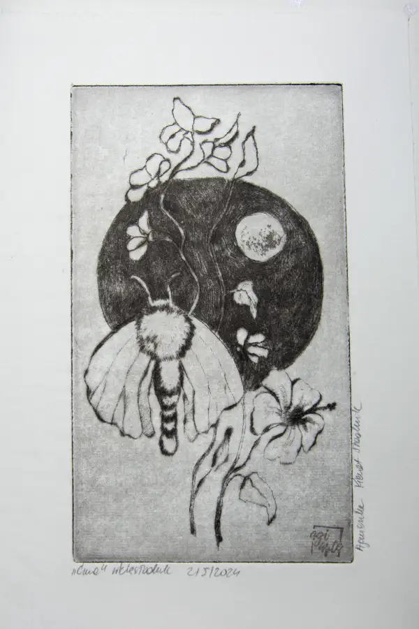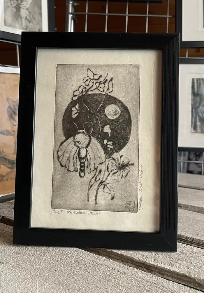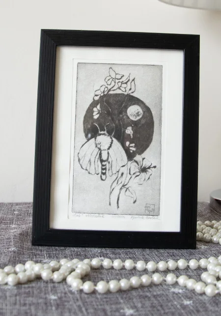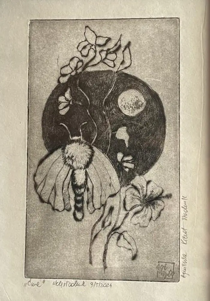 „Ćma” to grafika artystyczna – grafika wykonana jedną z najstarszych technik graficznych, warsztatowych. Grafika warsztatowa przedstawiająca ćmę na wzorze florystycznym w towarzystwie księżyca. Wydrukowana została dotychczas w 1 nakładzie kilku sztuk, przez co grafika ta jest unikatowa i niepowtarzalna. Jej niepowtarzalność polega również na tym, że każda z odbitek ma nieco inne odcienie, inną kolorystykę, inne natężenie światła i cienia, czasem różniące się pewne detale, dlatego nie ma dwóch takich samych, a ich ilość jest limitowana. Kolorystyka – różne odcienie brązu, czerni. Grafiki odbite zostały na papierze o kolorze lekko beżowym i białym.