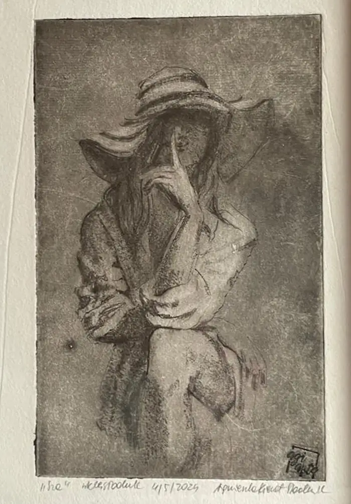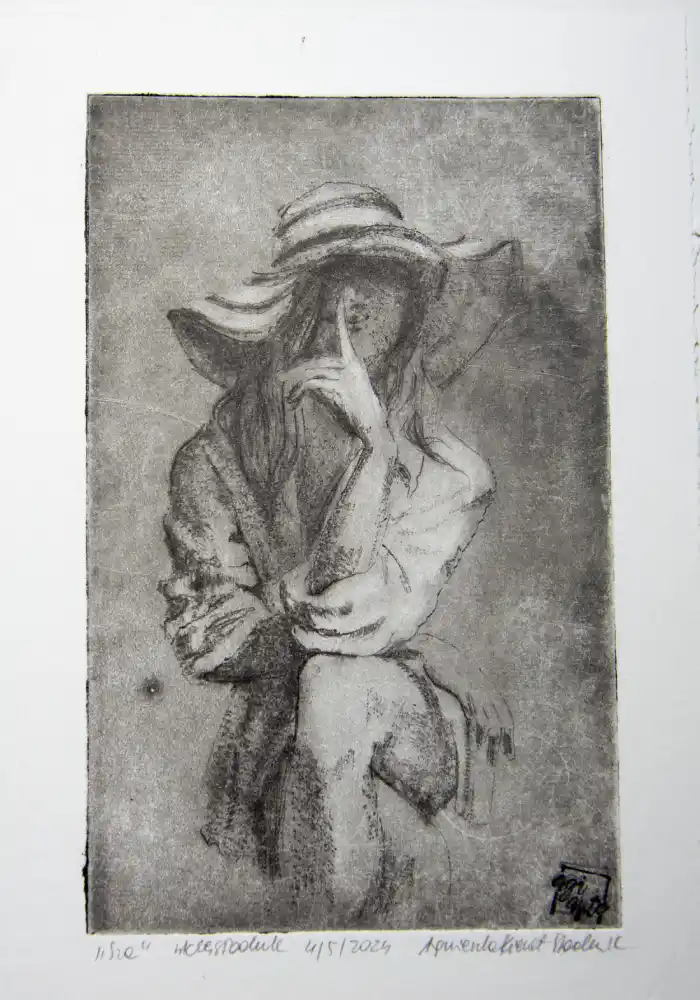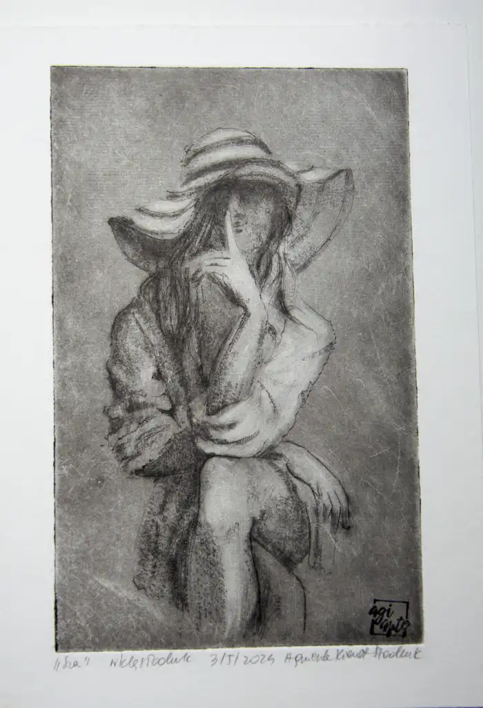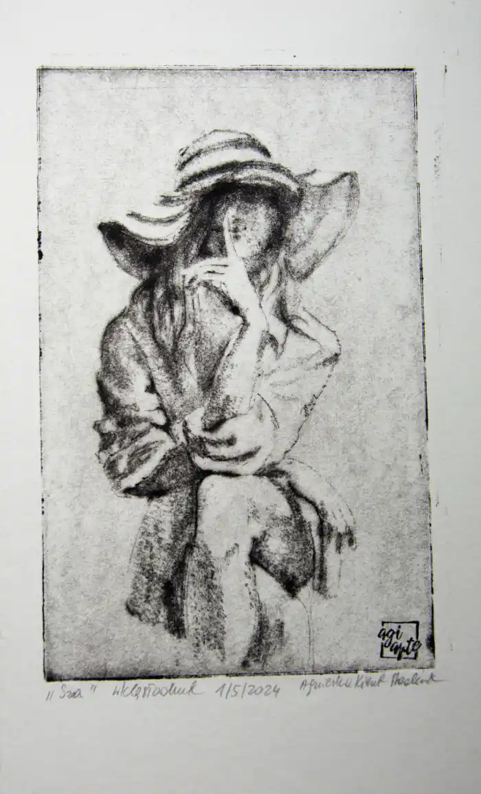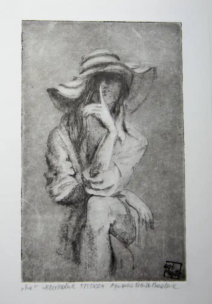 „Sza” to grafika artystyczna – grafika wykonana jedną z najstarszych technik graficznych, warsztatowych. Grafika warsztatowa przedstawiająca kobietę w kapeluszu siedzącą na krześle. Kobieta zatyka usta w geście tajemnicy. Wydrukowana została dotychczas w 1 nakładzie kilku sztuk, przez co grafika ta jest unikatowa i niepowtarzalna. Jej niepowtarzalność polega również na tym, że każda z odbitek ma nieco inne odcienie, inną kolorystykę, inne natężenie światła i cienia, czasem różniące się pewne detale, dlatego nie ma dwóch takich samych, a ich ilość jest limitowana. Kolorystyka – różne odcienie brązu, czerni. Grafiki odbite zostały na papierze o kolorze lekko beżowym i białym.