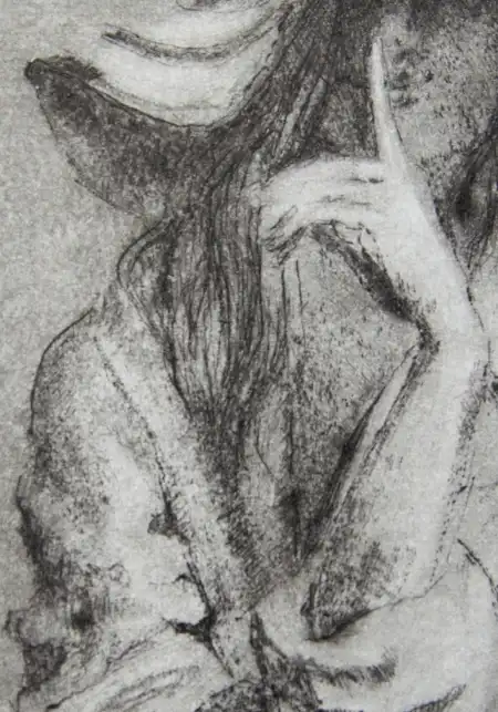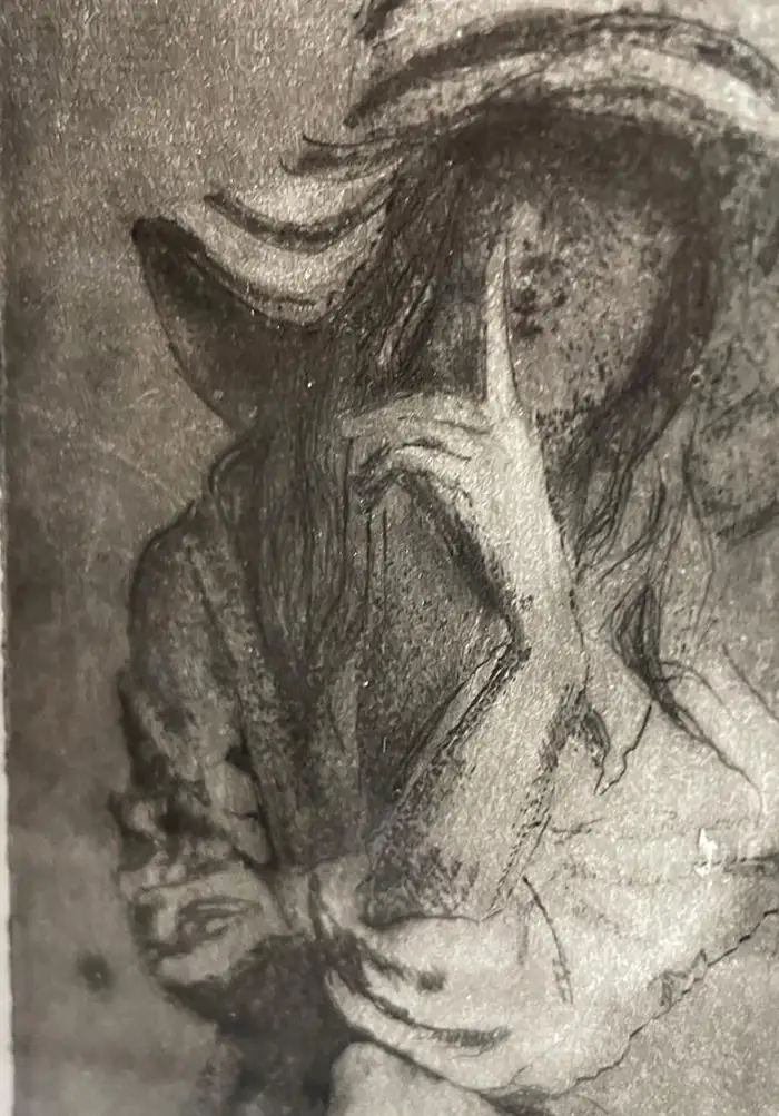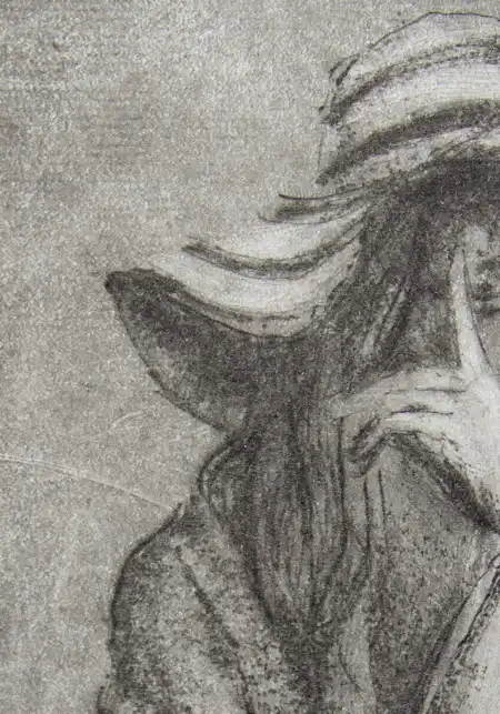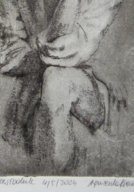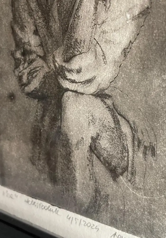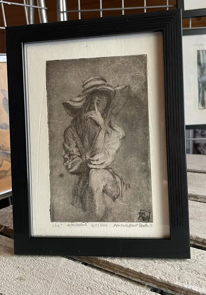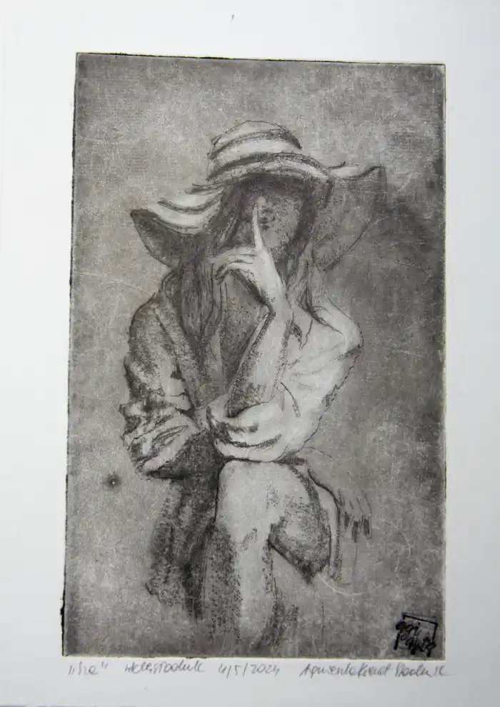 „Sza” to grafika artystyczna – grafika wykonana jedną z najstarszych technik graficznych, warsztatowych. Grafika warsztatowa przedstawiająca kobietę w kapeluszu siedzącą na krześle. Kobieta zatyka usta w geście tajemnicy. Wydrukowana została dotychczas w 1 nakładzie kilku sztuk, przez co grafika ta jest unikatowa i niepowtarzalna. Jej niepowtarzalność polega również na tym, że każda z odbitek ma nieco inne odcienie, inną kolorystykę, inne natężenie światła i cienia, czasem różniące się pewne detale, dlatego nie ma dwóch takich samych, a ich ilość jest limitowana. Kolorystyka – różne odcienie brązu, czerni. Grafiki odbite zostały na papierze o kolorze lekko beżowym i białym.
